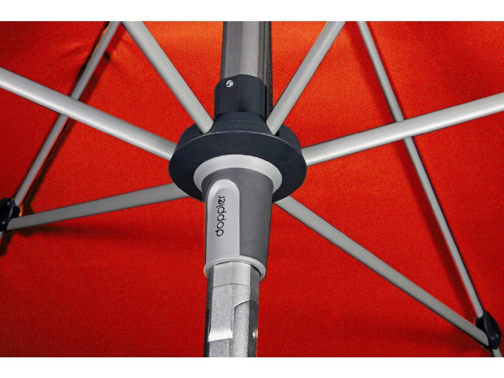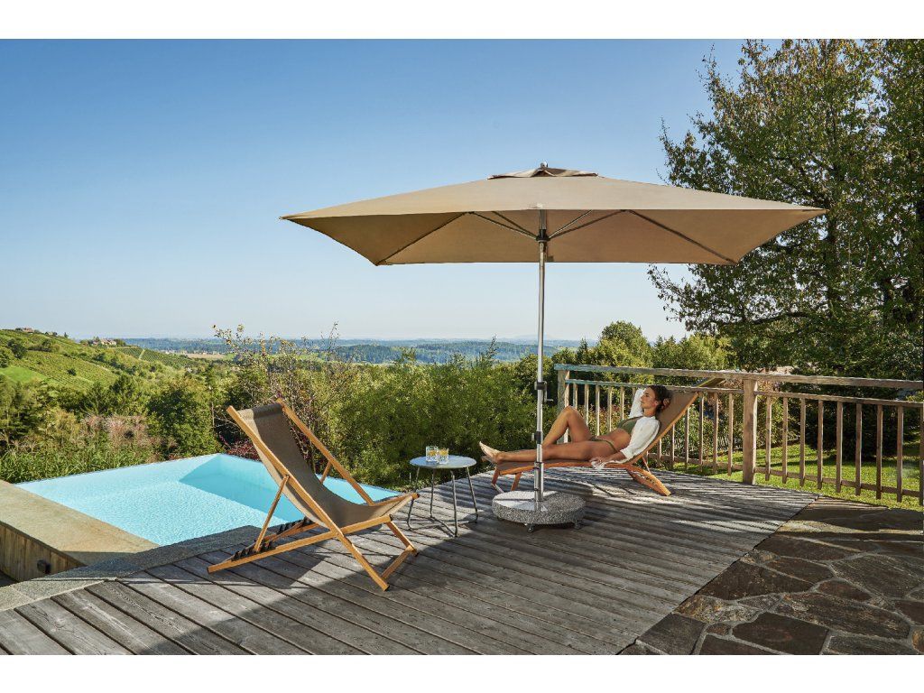 Tento moderní, lehký a stabilní slunečník je ideálním společníkem na balkón, terasu, nebo zahradu. Slunečník má kvalitní hliníkovou konstrukci a funkci automatického naklápěcího kloubu. Lze výškově nastavit. Potah je vyroben z 100% polyesterové tkaniny odolné povětrnostním vlivům s vynikající UV ochranou 80+. Má snímatelný potah pro ruční praní. Díky ventilačnímu otvoru ve střeše se pod slunečníkem nekumuluje horký letní vzduch.