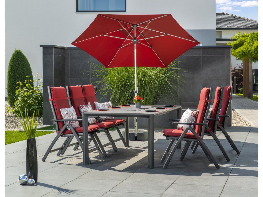 | Vlastnosti a funkce: | Odolný povětrnostním vlivům, Otočný kolem osy, Snímatelný/ručně pratelný potah slunečníku, Výškově nastavitelný, Naklápěcí, Automatické otevírání klikou |