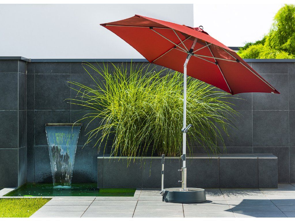 Tento moderní, lehký, stabilní slunečník je ideálním společníkem na balkón, terasu, nebo zahradu. Slunečník má kvalitní hliníkovou konstrukci a funkci automatického naklápěcího kloubu. Lze výškově nastavit. Potah je vyroben z 100% polyesterové tkaniny odolné povětrnostním vlivům s vynikající UV ochranou 80+. Má snímatelný potah pro ruční praní. Díky ventilačnímu otvoru ve střeše se pod slunečníkem nekumuluje horký letní vzduch.